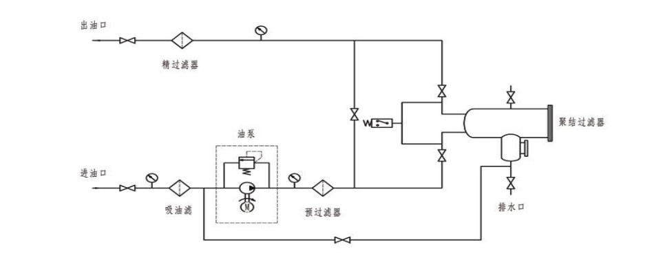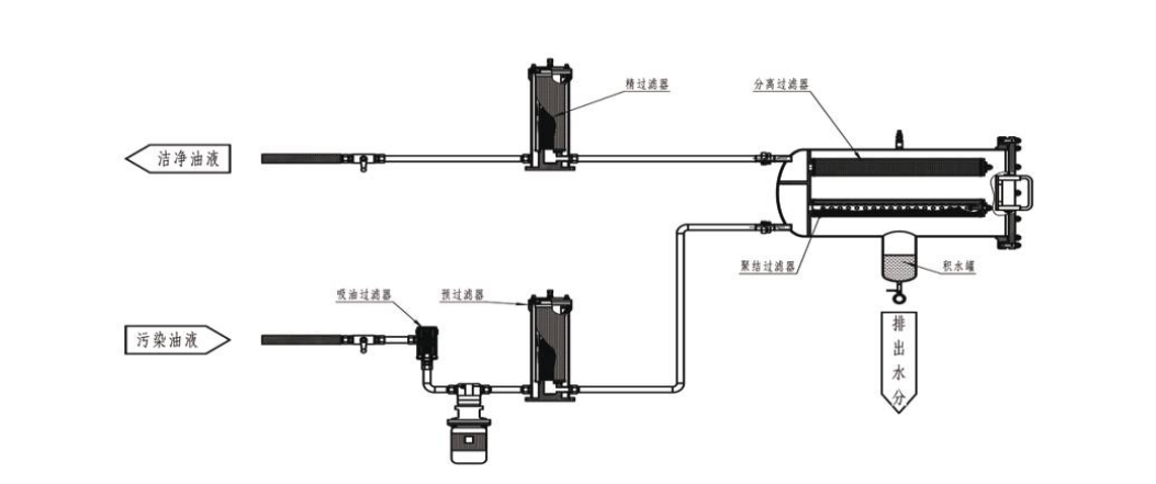 顆粒過濾系統: 采用高效濾材做過濾介質,超大過濾面積設計,可有效地濾除極細微的顆粒雜質,使油品達到很高的清潔度。聚結系統: 聚結系統由一組聚結濾芯組成,聚結濾芯采用了獨特的極性分子結構,油液中的游離水及乳化水在通過濾芯后,被聚結成較大的水滴,再依靠重力的作用下沉降至儲水罐內。分離系統: 分離系統的分離濾芯由特殊的疏水材料制成,油液通過濾芯時,水珠被擋在濾芯的外表面,相互聚結直至因重力作用,沉降至儲水罐內。排水系統: 分離出來的水份儲存在儲水罐內,當界面高度到達到設定值時,打開閥門將水排出,直至降到下液面,關閉閥門,停止排水。