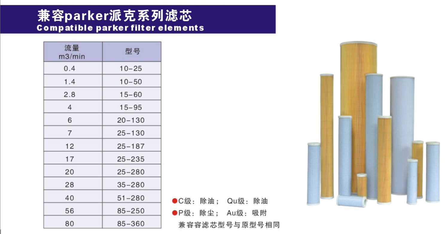 粉塵過(guò)濾器:用于過(guò)濾1-3μm固體和液體顆粒、殘余含油量:1ppm精密過(guò)濾器:用于過(guò)濾0.1-0.3μm的固體和液體顆粒;過(guò)濾效率:99.99%高精密過(guò)濾器:用于過(guò)濾0.01μm的固體和液體顆粒;過(guò)濾效率:99.99%活性炭過(guò)濾器:用于0.01μm固體和液體顆粒;除去壓縮空氣中的異味派克精密濾芯采用抗油耐酸類化學(xué)腐蝕的封閉涂沫泡套筒,防止了聚結(jié)液體重新進(jìn)入氣流,確保了高效率除油。兼容美國(guó)派克精密濾芯標(biāo)準(zhǔn)型號(hào):