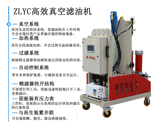 ZLYC-100高效真空濾油機可綜合除去油液中的游離水和部分溶解水及氣體、顆粒等污染物,濾油機適用于各種油品的深度凈化。ZLYC-100高效真空濾油機...