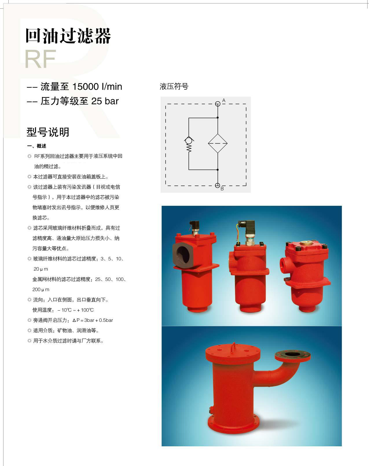 RF系列回油過濾器主要用于液壓系統中回油的精過濾。我公司生產的國產賀德克過濾器可替代原廠使用,如需原廠產品請聯系賀德克代理或經銷商!