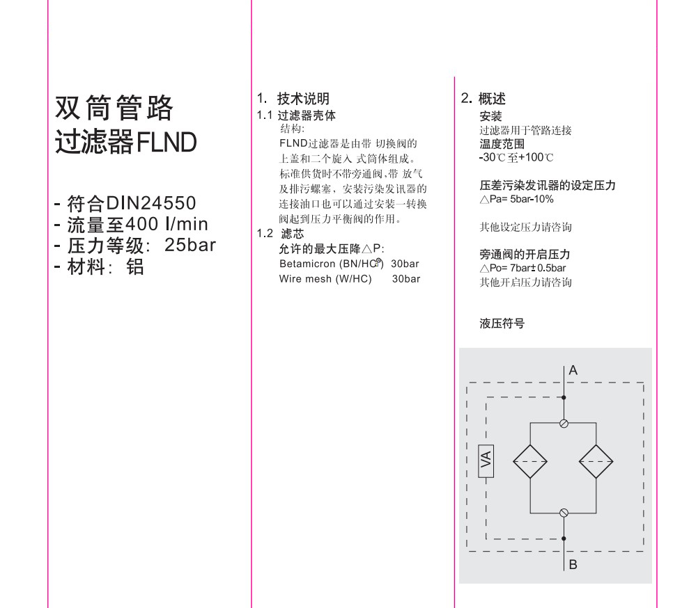 FLND系列賀德克過濾器主要用于液壓系統管路中介質的精過濾!國產賀德克過濾器,非原廠產品,需要原廠產品請聯系賀德克代理經銷商!