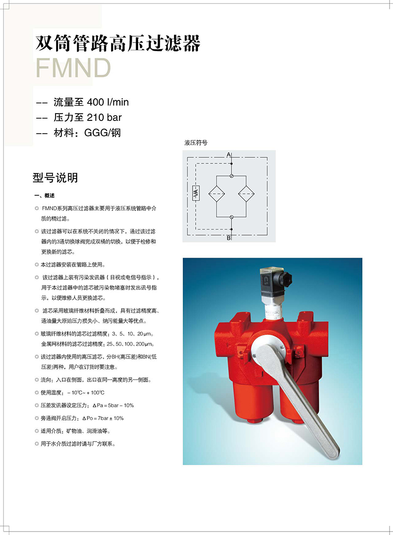 FMND系列雙筒過濾器主要用于液壓系統管路中介質的精過濾!國產賀德克過濾器,非原廠產品,需要原廠產品請聯系賀德克代理經銷商!