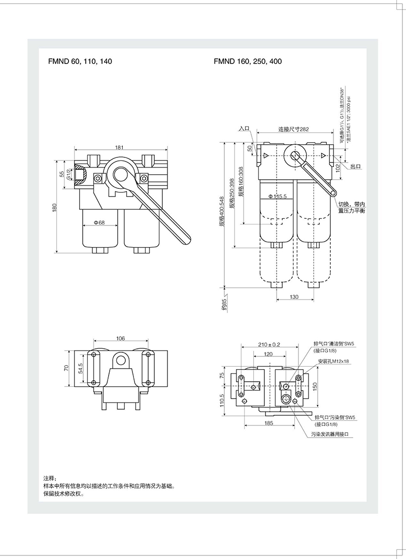 我司生產的FMND系列雙筒過濾器和原廠產品尺寸規格一致,滿足國內用戶的使用需求,質保一年,隨時接受客戶的問題反饋,大大降低生產費用,符合國家進口產品國產化的戰略方向!型號推薦:FMND60 FMND110 FMND140 FMND160 FMND250 FMND400