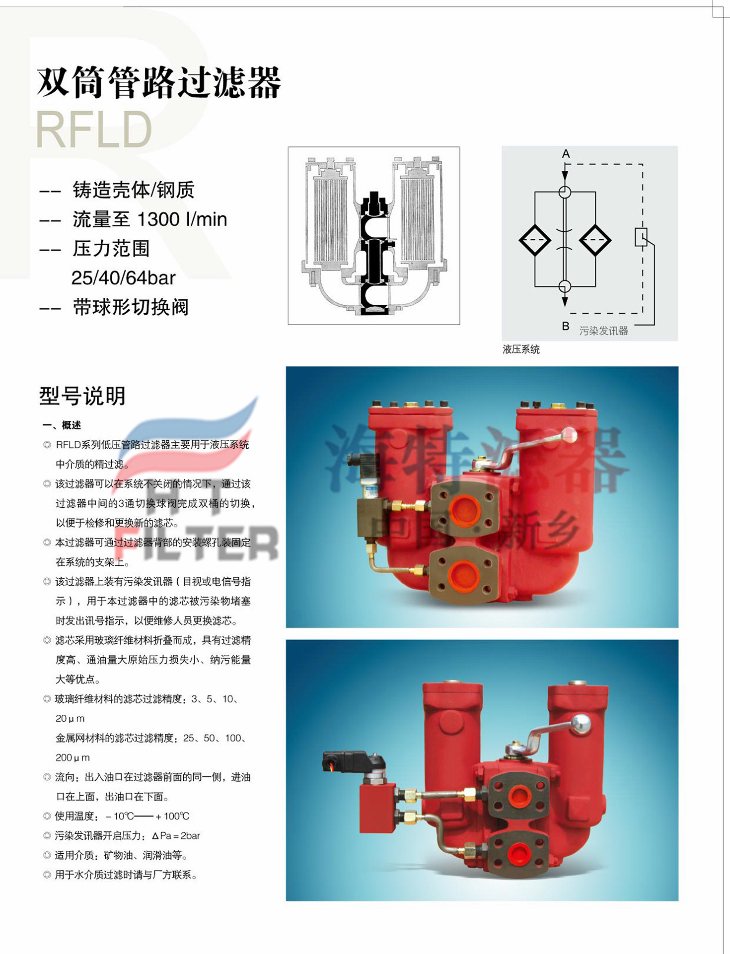 RFLD鑄造式雙筒管路過濾器主要用于液壓系統中介質的精過濾,國產賀德克過濾器,非原廠產品,需要原廠產品請聯系賀德克代理經銷商!