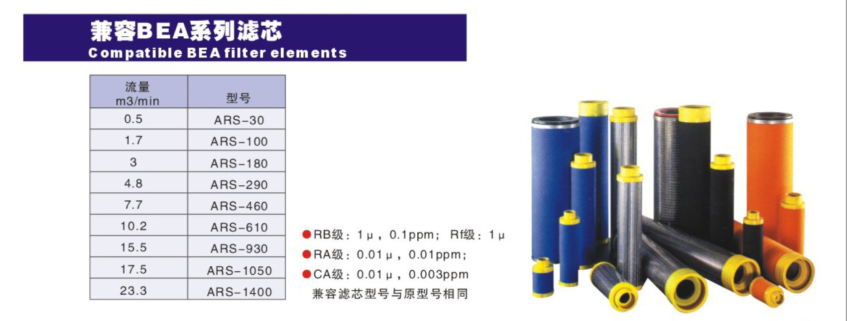 我公司新近研發(fā)的國(guó)產(chǎn)兼容意大利BEA精密濾芯根據(jù)不同過(guò)濾精度級(jí)別,濾芯采用不同結(jié)構(gòu)型式、新型&ldquo;矩陣混合纖維&rdquo;使介質(zhì)接觸面積面積大,改進(jìn)了濾除率,提高過(guò)濾效果。現(xiàn)廣泛應(yīng)用在石油、電子、化工、冶金、發(fā)電、制藥、食品、醫(yī)院等各行業(yè)的各種空壓機(jī)系統(tǒng)的空氣凈化中。