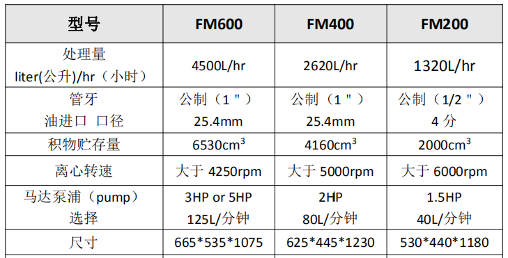 FM系列離心式濾油機(jī)技術(shù)參數(shù):