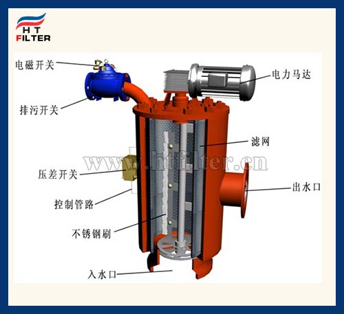 自清洗過濾器進出口的壓差達到預設值或達到清洗時間、手動預制時,過濾器將開始自清洗過程,整個自清洗過程包含兩個步驟:打開位于自清洗過濾器上的自動排污閥;電機帶動自清洗過濾器濾網內的清洗系統(清洗刷或掃描吸嘴),被濾網所攔截下來的雜質從排污閥排出。整個清洗過程耗時約15秒(可根據用戶要求設定),清洗時系統不斷流,自清洗過濾器的整個運行過程由隨機配備的一個智能控制箱來控制。控制方式可選壓差、時間、手動及PLC控制。