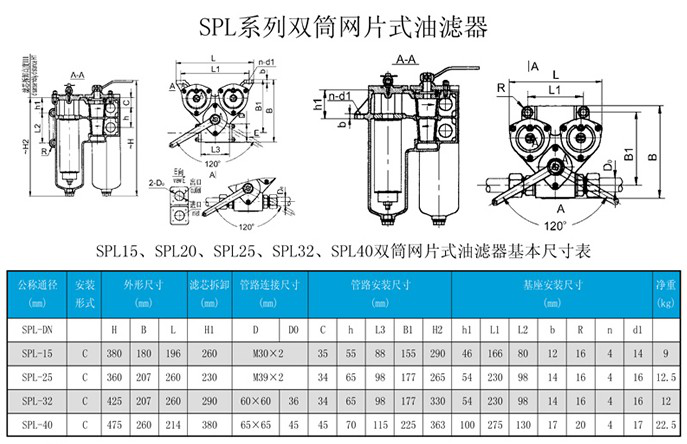 SPL雙筒網片式濾油器介紹:SPL雙筒網片式濾油器主要由殼體(我廠生產的網片式過濾器小型號殼體材質為鑄鋁,大型號殼體材質為碳鋼)、濾芯組件、轉換閥體等...